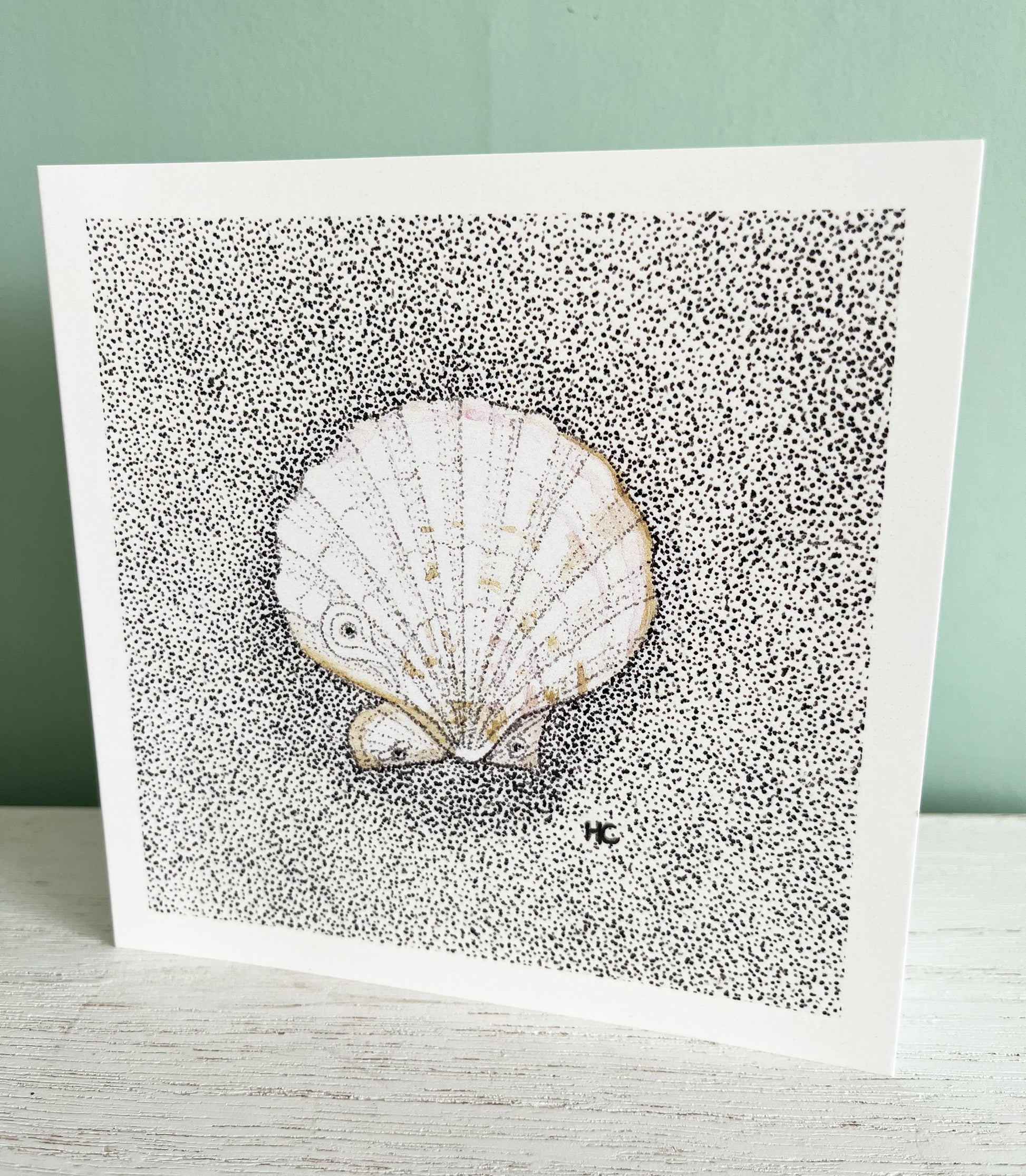 A beautiful, hand drawn image of a scallop shell totally made up of tiny dots by local artist Helen Campbell.