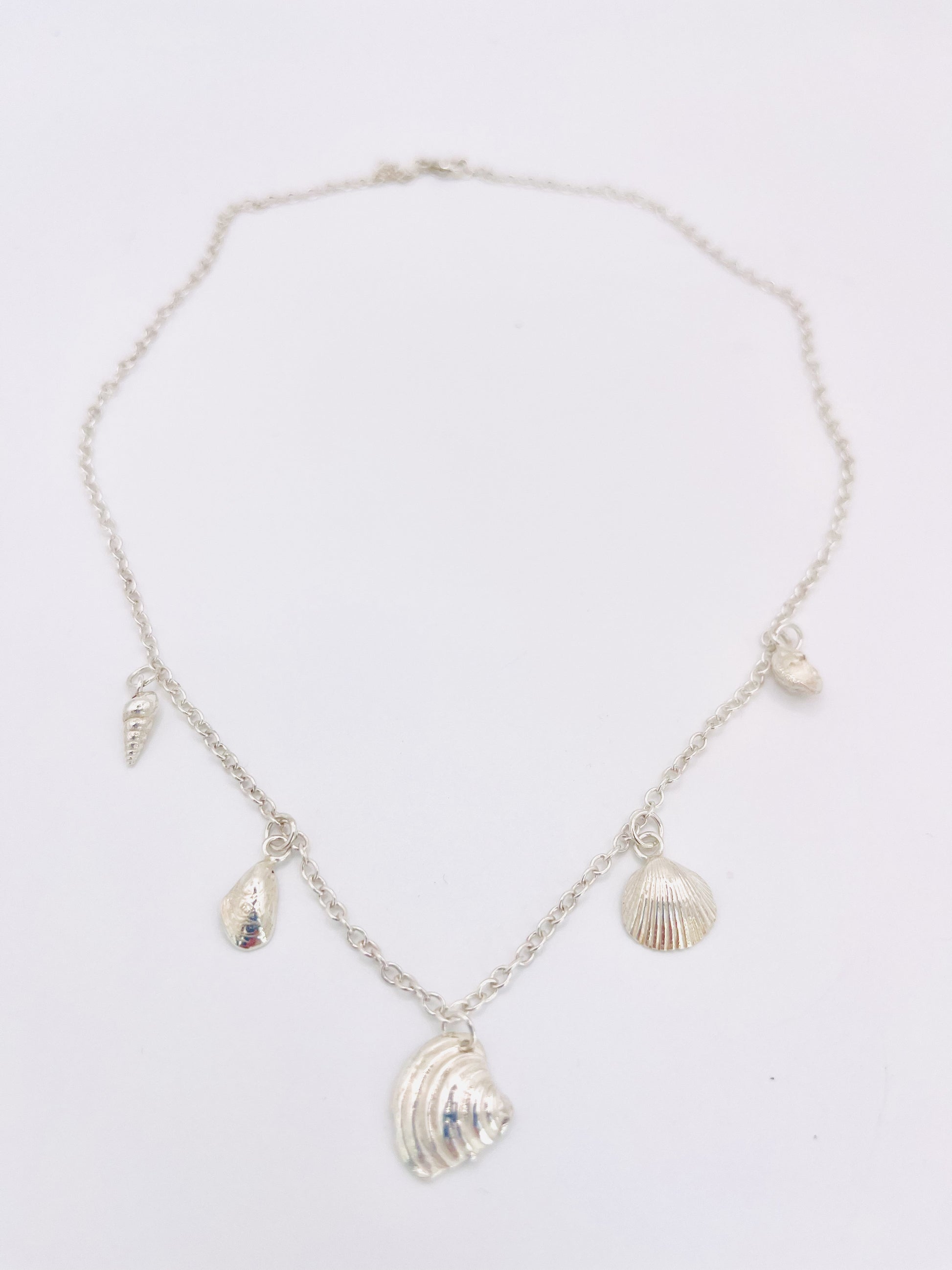 This beautiful 'shoreline' necklace brings together a collection of 4 different shells and a seed pod found on Devon beaches and cast into silver.