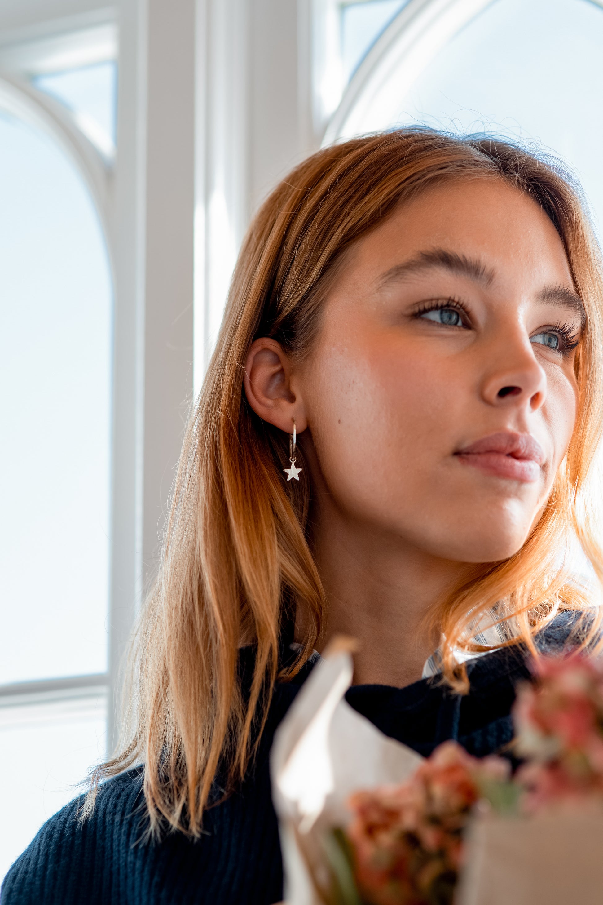A pair of Sterling Silver hoop earings with a cute little moving star that hangs down.